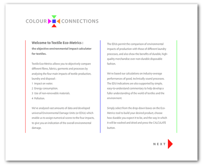 Step One: Once you have subscribed to Eco-Metrics you log onto your account. You will then see the Welcome Screen pictured below which describes exactly what the Eco-Metrics tool is. Clicking the NEXT button would then take you to the next screen.