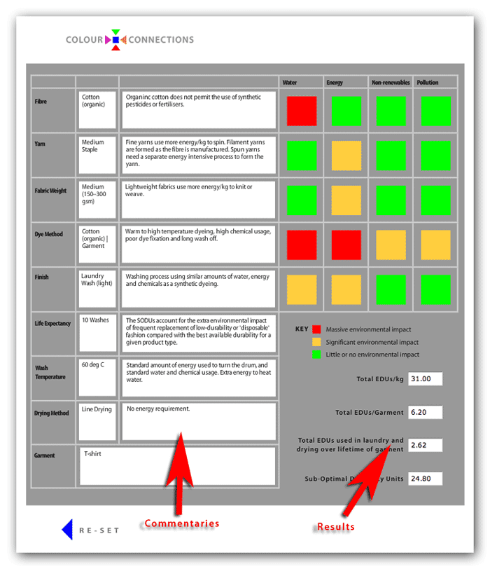 Simply click the blue re‐set button to return to the beginning and to calculate the environmental impact of another type of textile or garment.
